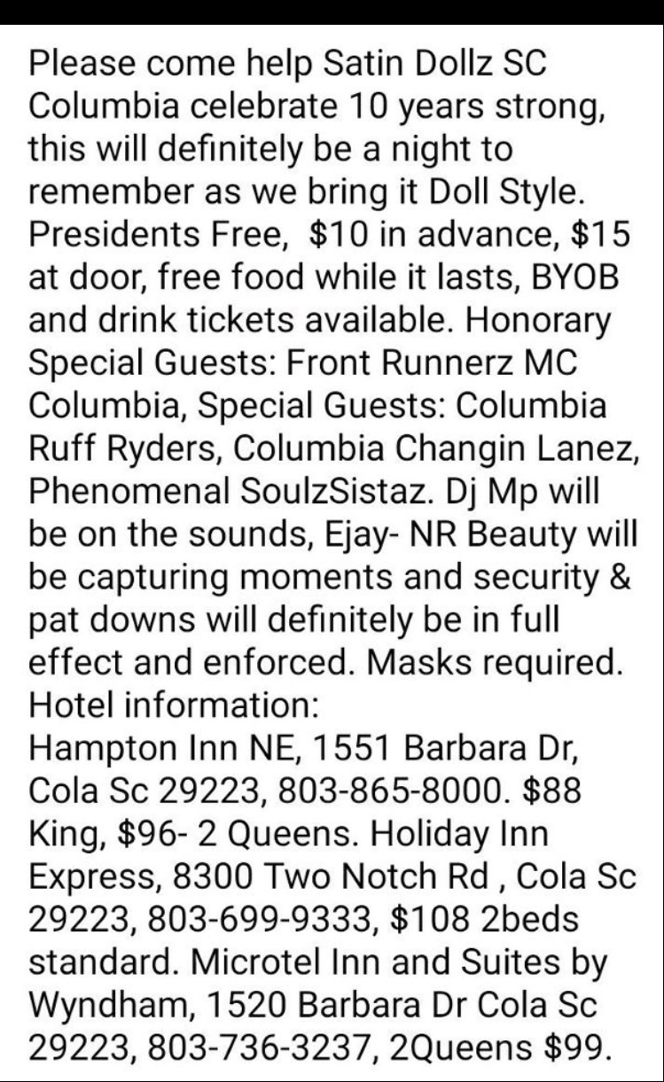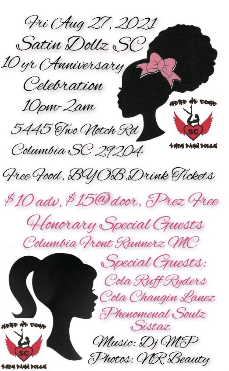 SATIN DOLLZ SC 11 YEAR MIX N MINGLE - FRIDAY AUGUST 26,2022 AT QUAKER STAKE & LUBE 2154 S BELTLINE BLVD COLA, SC 29201 = FREE ENTRY 8-12